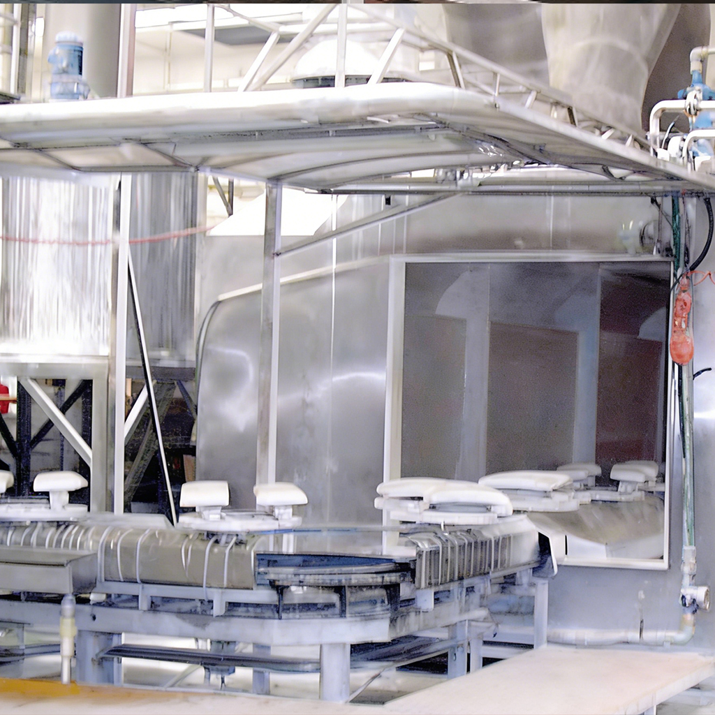 这条连续、循环的生产线可以集除尘、上釉、釉浆回收各种规格的卫浴产品于一体。这是上釉的自动循环线。在这条生产线上,所有的核心和辅助工艺都是同时完成的。